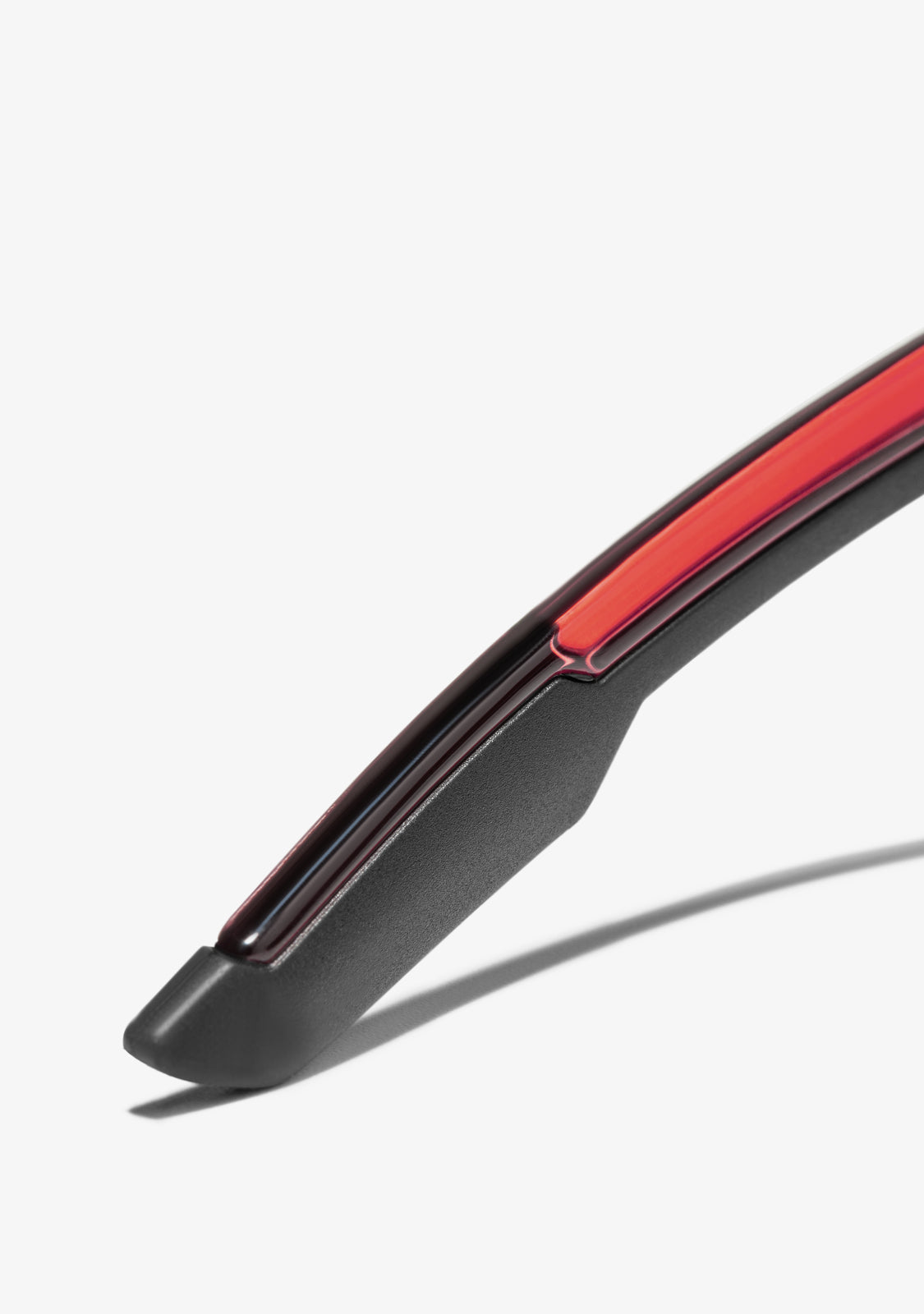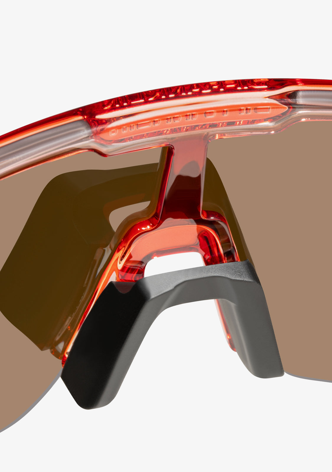 The Wind model features a reddish finish and an aerodynamic frame. It has a uniform front of 144 mm and a lens width of 140 mm, exclusively designed to facilitate wind movement. The arms are 130 mm long and feature our emblem on both sides. Additionally, both the tips and the nose bridge have silicone pads for a perfect grip.