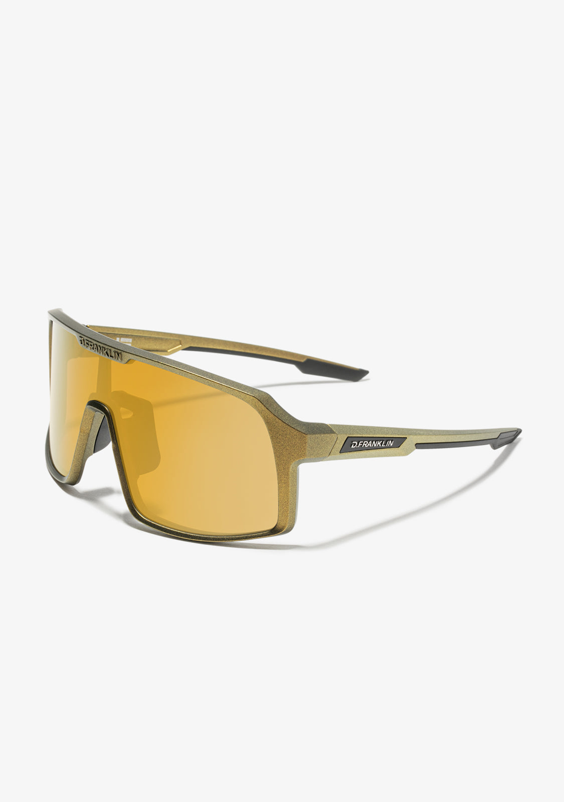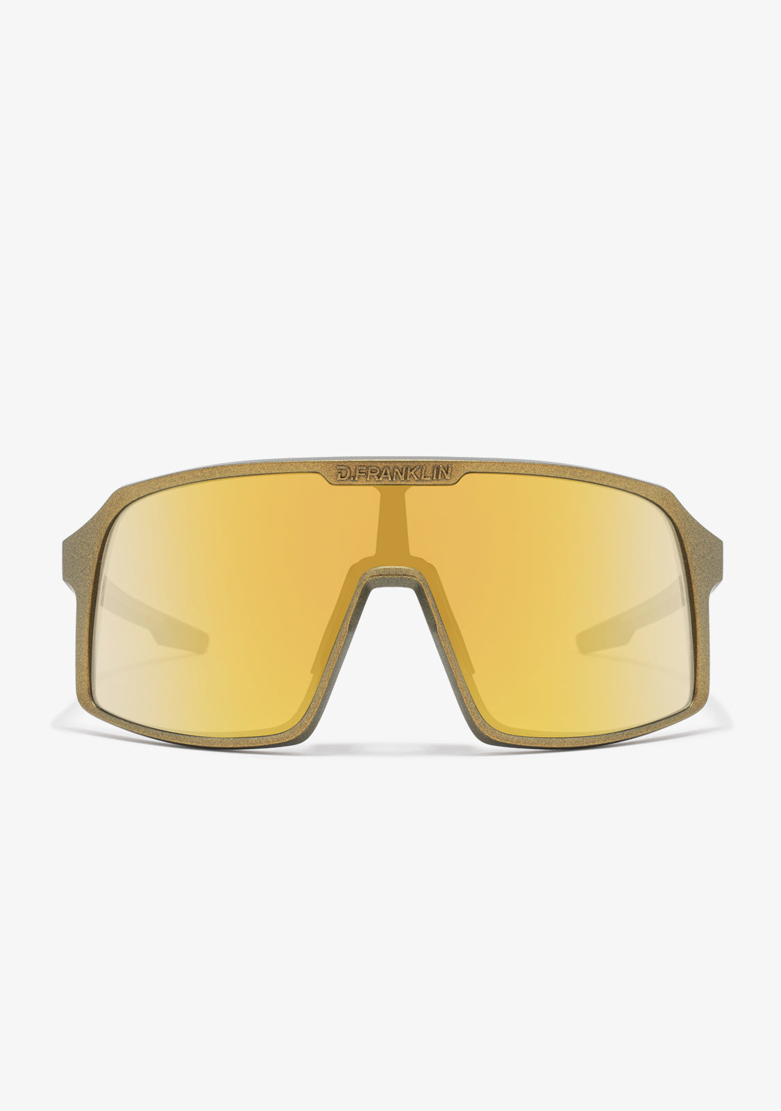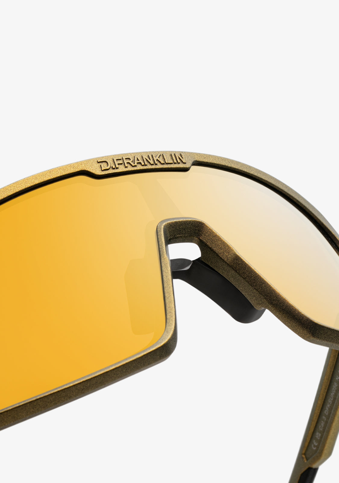 No matter the weather, no matter the field… explore new limits with the new Wind Limited collection by D.Franklin. Unmistakable sports sunglasses, created with high quality materials, superior lightness and an exclusive metallic finish. The Wind Limited Iridiscent Gold / Gold model guarantees maximum protection and comfort thanks to its panoramic mirrored lenses and silicone nose pads.